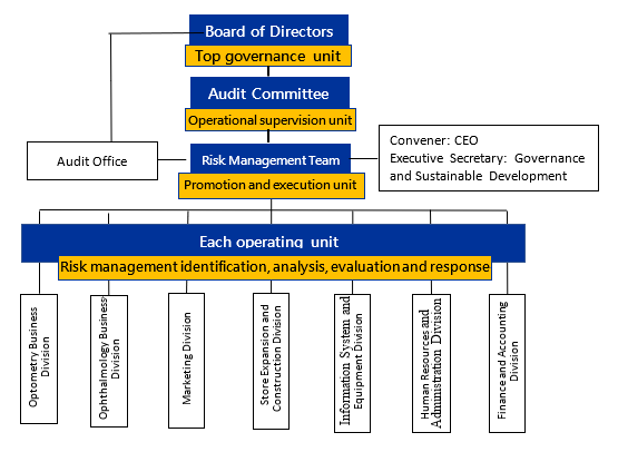 | Finance risk | Factors such as overall economic and industrial changes at home and abroad have an impact on the company's finances, such as interest rates, exchange rates, credit and solvency, liquidity risks, accounting policies and other risks. | 1、 Interest Rate Risk: Monitor changes in the interest rate market, assess capital requirements, maintain strong banking relationships, and strive for optimal financing and deposit rates. 2、 Exchange Rate Risk: Primarily involves adjustments to foreign currency conversions related to long-term overseas investments. Receivables and payables generated from operations are mainly settled in New Taiwan Dollars (NTD) through local market transactions and agent procurement, with minimal direct import, export, or overseas sales. Therefore, the impact of exchange rate risk is relatively small. 3、 Credit Risk: Receivables are monitored by monthly reports for brand-authorized partner clinics and daily cash/credit card reports for direct-operated optical retail customers. 4、 Financial Changes: Regular monitoring of financial statements to track financial structure, debt repayment ability, operational performance, profitability, and cash flow. | Finance and Accounting Division | |
