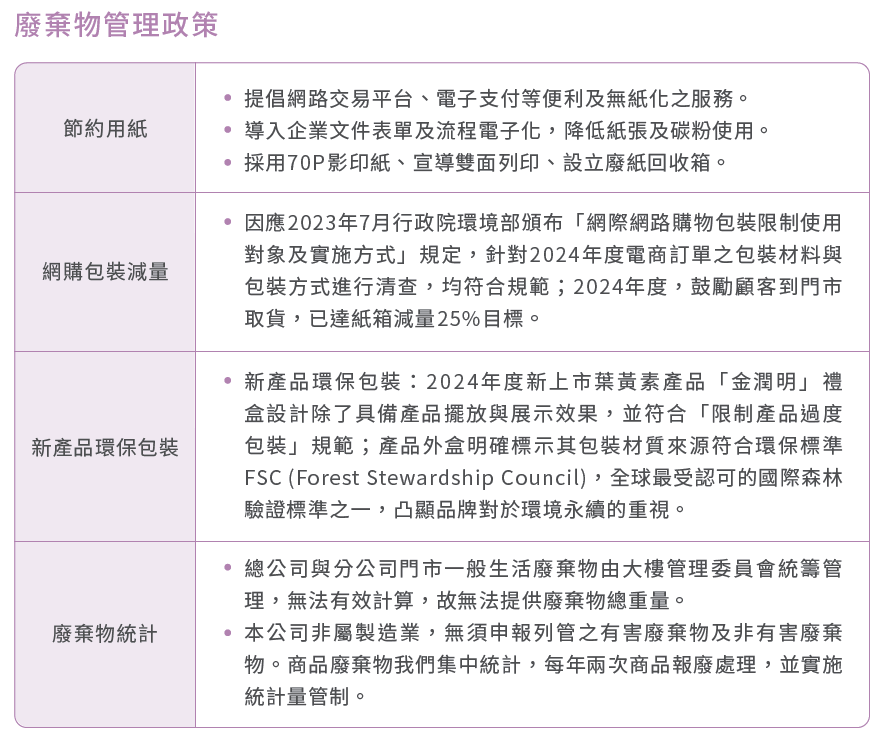 大學光重視水資源管理。但是公司非屬製造業,並無生產製程或實驗室的汙水排放,總公司南港辦公室與分公司各門市的取水量相對少,對水資源亦無重大生態影響。