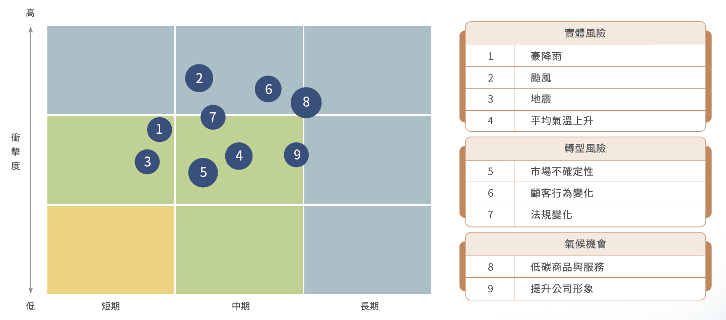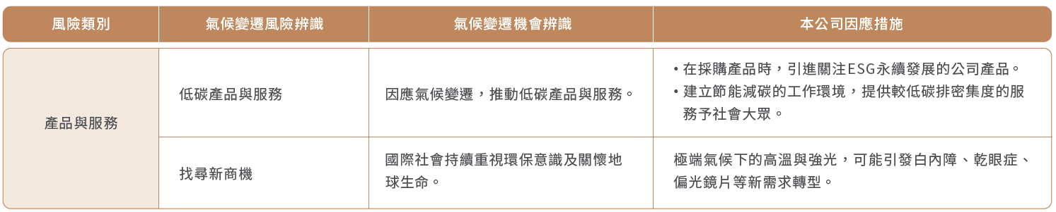 04 指標和目標氣候變遷之風險辨識及因應措施雖然耗能、用水及廢棄物管理並非本公司重大性議題,但我們仍透過溫室氣體盤查結果,導入循環經濟思維,減少廢棄物的浪費及強化氣候與環境議題的倡議,提升同仁與合作單位的認同,以減少營運過程中所產生的碳排量。本公司針對氣候變遷進行風險辨識,包含因極端氣候造成直接或間接之衝擊、因法規、技術或市場需求的轉型影響以及其他人文、社會面向對公司營運活動造成之風險與機會進行分析。並依分析結果建置風險管理策略計畫作為因應氣候變遷行動的核心,並辨別相關的機會,以降低風險並掌握商機,茲將評估結果彙整如下:
