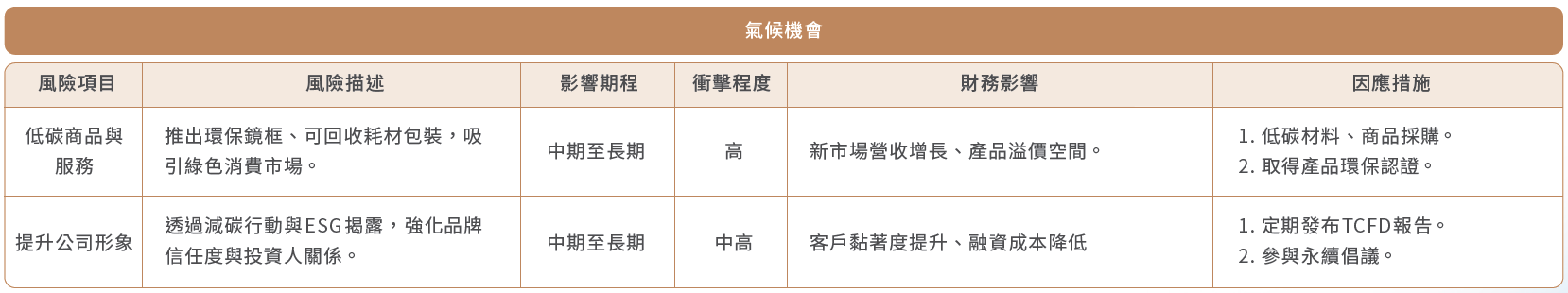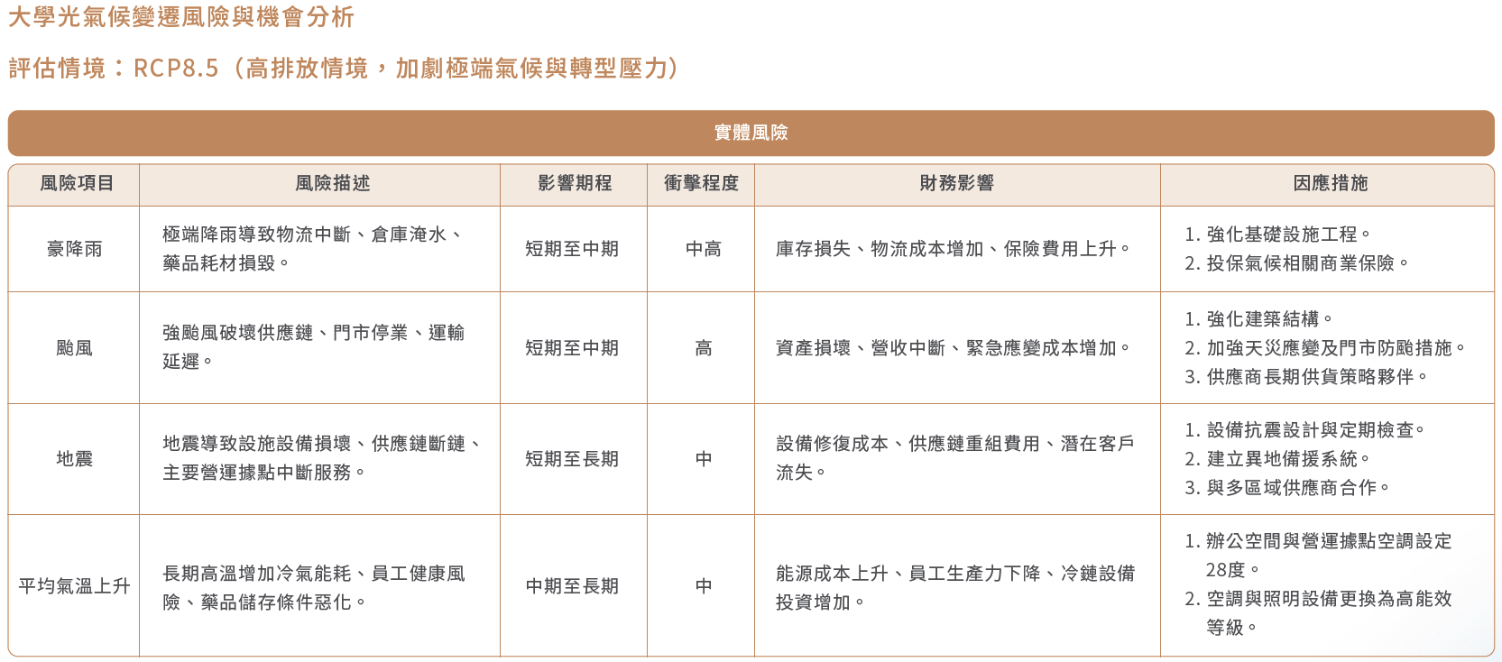02 策略治理暨永續發展室以TCFD 項目評估大學光現今面臨的重大氣候風險與機會,並依此產出TCFD重大性矩陣,分析短、中、長期各時程可能發生的實體與轉型風險,以及相關的企業機會。公司以進一步擬定減緩及調適策略,強化企業的氣候韌性,結果如下所示: