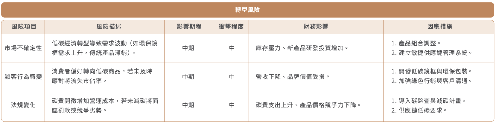 ■ 氣候變遷轉型風險分析大學光不屬於能源密集性產業,我們仍密切關注全球氣候相關措施,分析轉型風險可能造成的財務衝擊。據評估結果,法規及消費者行為變化短期不會對營運造成顯著影響,為減少中長期轉型風險的影響,我們持續推動各項節能措施,並尋求各種可能的減碳機會。