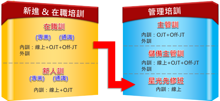 - 在職人員:公司經營理念、政策及各單位之訓練需求與發展目標,依據各職務之工作職掌與專業領域擬定在職訓練計劃。訓練範圍包括內部訓練、委外訓練及廠商培訓,訓練方式包含線上學習、實體課程、派外訓練、工作中OJT。