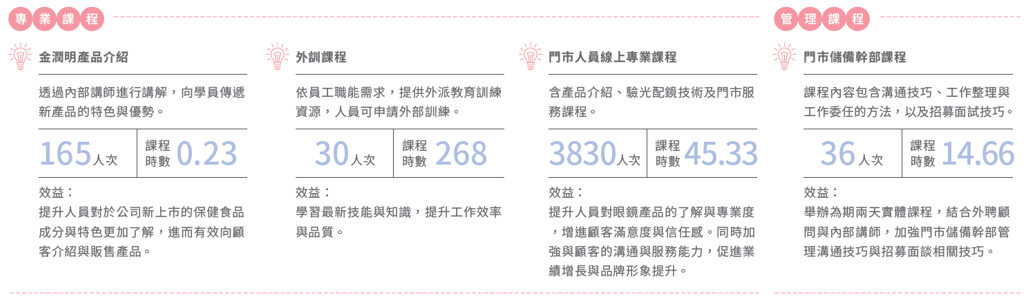 - 依「訓練藍圖2.0」,針對視光師進行專業職能分級設置及年度培訓規劃,並依規劃持續開發專業課程,以提供視光師符合實務需求且具系統性的在職專業訓練。