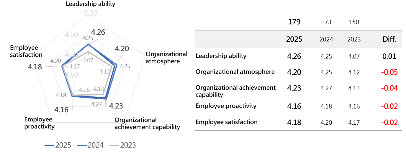 In 2025, “leadership” remains at the same level as in 2024. “Organizational atmosphere” and “organizational achievement capability” have slightly decreased compared to 2024 but still surpass the 2023 levels. “Employee proactivity” and “Employee satisfaction” have remained at the same level for three consecutive years.