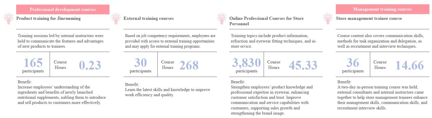 - The Company has carried out staffing as well as cultivation and training planning by professional functions grading for optometrists in accordance with the Training Blueprint 2.0, and has continuously developed professional courses according to the plan to provide optometrists with systematic on-the-job professional training that meets their practical needs.