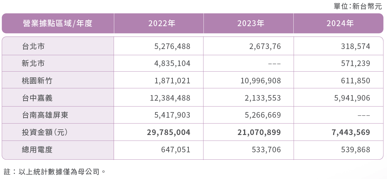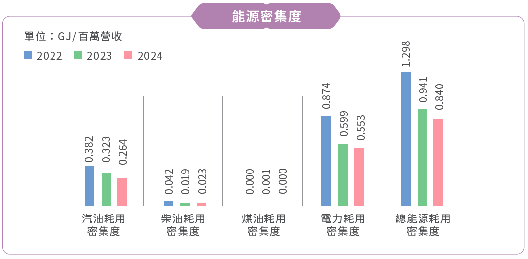 2024年度投資節能設備總金額7,443,569元,反應在2022年至2024年的總用電度與用電密集度均逐年下降。以下為最近三年度節能設備投資金額: