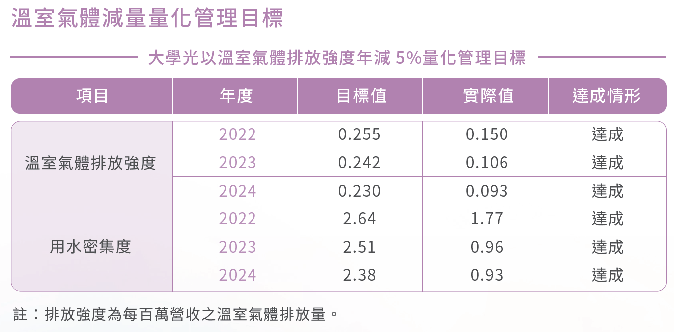 短期減量目標大學光以 2020年為基期年,揭示 2021 及2024年之溫室氣體減量、減少用水之年減 5% 量化管理目標:
