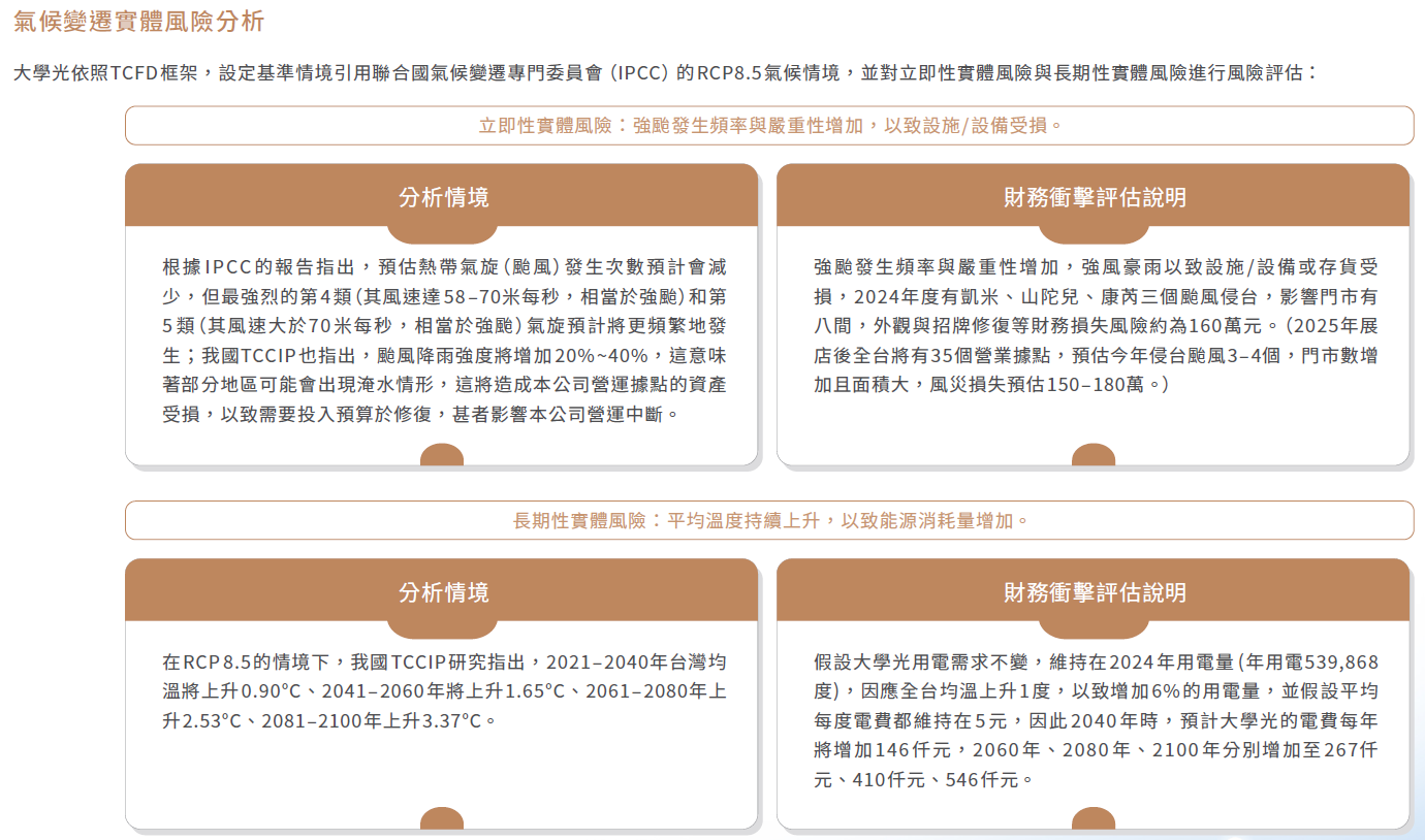 ■ 氣候變遷轉型風險分析大學光不屬於能源密集性產業,我們仍密切關注全球氣候相關措施,分析轉型風險可能造成的財務衝擊。據評估結果,法規及消費者行為變化短期不會對營運造成顯著影響,為減少中長期轉型風險的影響,我們持續推動各項節能措施,並尋求各種可能的減碳機會。