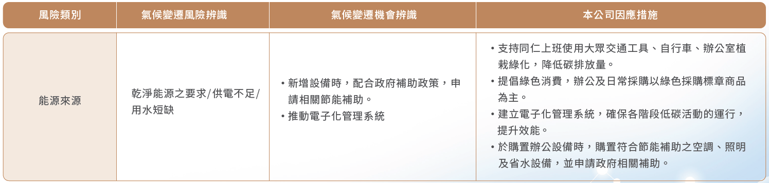 04 指標和目標氣候變遷之風險辨識及因應措施雖然耗能、用水及廢棄物管理並非本公司重大性議題,但我們仍透過溫室氣體盤查結果,導入循環經濟思維,減少廢棄物的浪費及強化氣候與環境議題的倡議,提升同仁與合作單位的認同,以減少營運過程中所產生的碳排量。本公司針對氣候變遷進行風險辨識,包含因極端氣候造成直接或間接之衝擊、因法規、技術或市場需求的轉型影響以及其他人文、社會面向對公司營運活動造成之風險與機會進行分析。並依分析結果建置風險管理策略計畫作為因應氣候變遷行動的核心,並辨別相關的機會,以降低風險並掌握商機,茲將評估結果彙整如下: