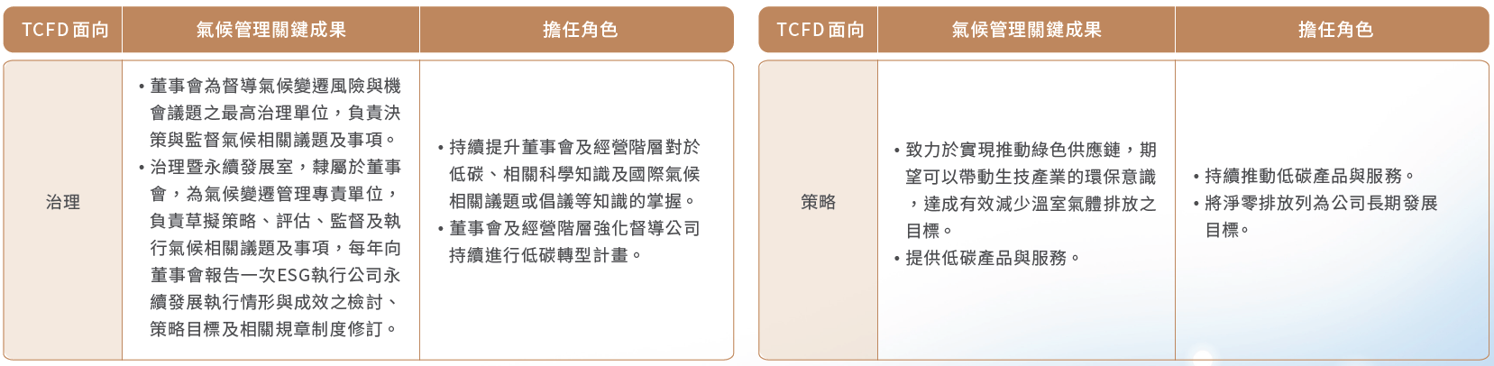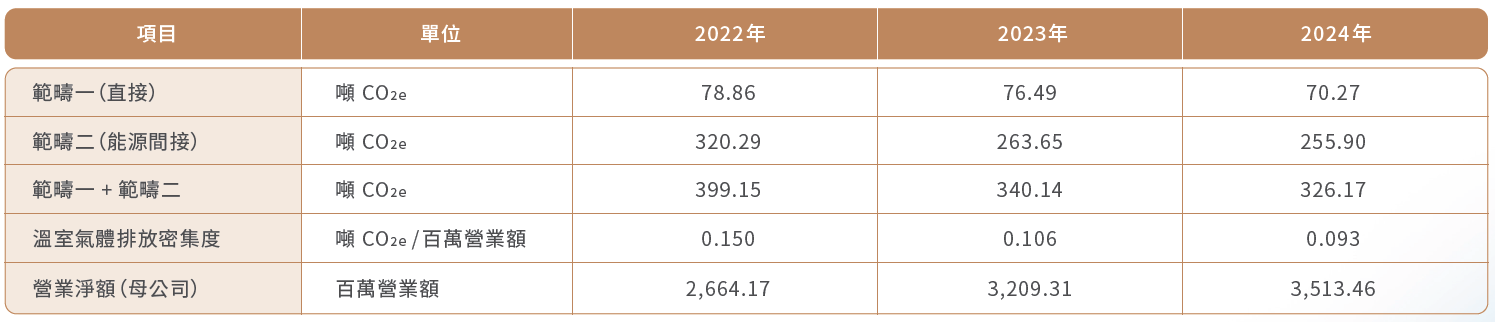 為落實企業永續發展,董事會通過「永續發展實務守則」,並成立治理暨永續發展室,展開各項永續行動。在氣候行動方面,擔任橫向串聯與垂直整合的平台,自主管理完成溫室氣體盤查與揭露,換算排放總量如下: